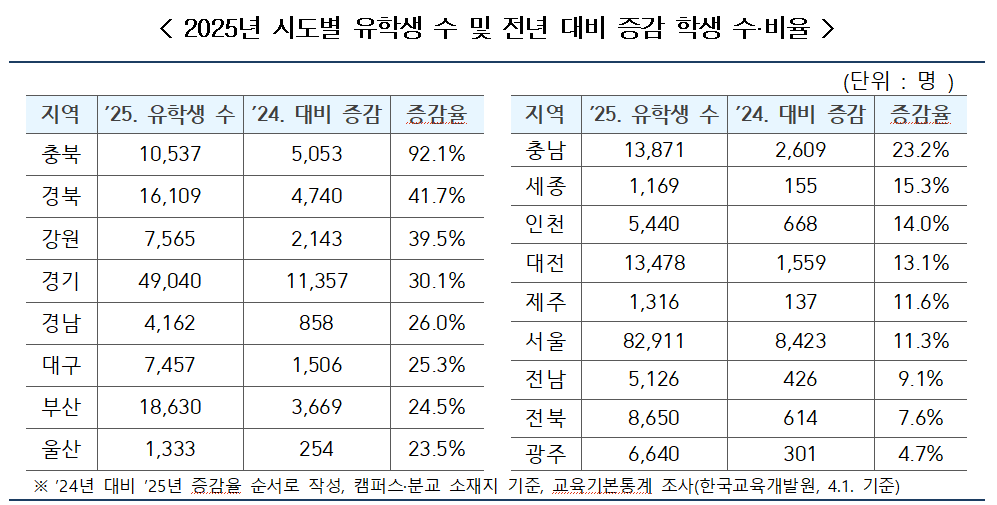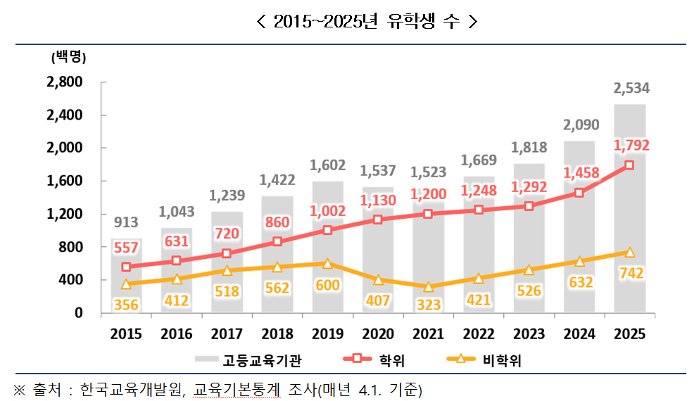 올해 외국인 유학생 수는 25만 3천 명으로 지난해보다 21.3% 증가했다. 특히 전체의 70.7%가 학위과정에 등록했으며, 이공계 전공 비율도 늘어났다. 수도권 집중 현상도 완화돼, 비수도권 유학생 비중은 45.8%로 소폭 상승했다.