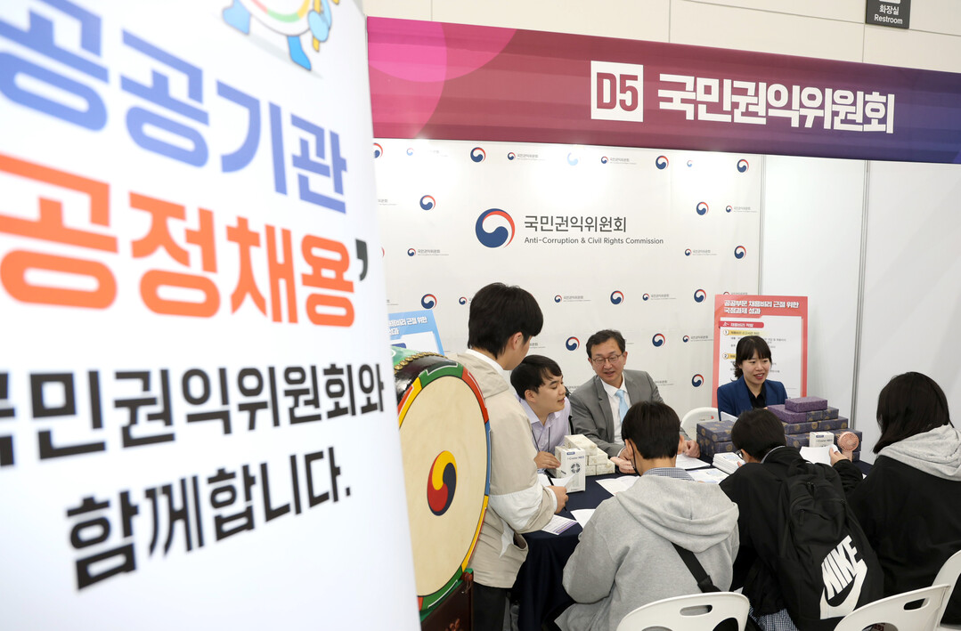 | ▲정승윤 국민권익위원회 부위원장이 지난해 5월 14일 세종시 어진동 정부세종컨벤션센터에서 열린 '2024 충청권 공공기관 지역인재 합동 채용설명회'에서 권익위 공정채용 부스를 찾아 일일상담을 하고 있다. |