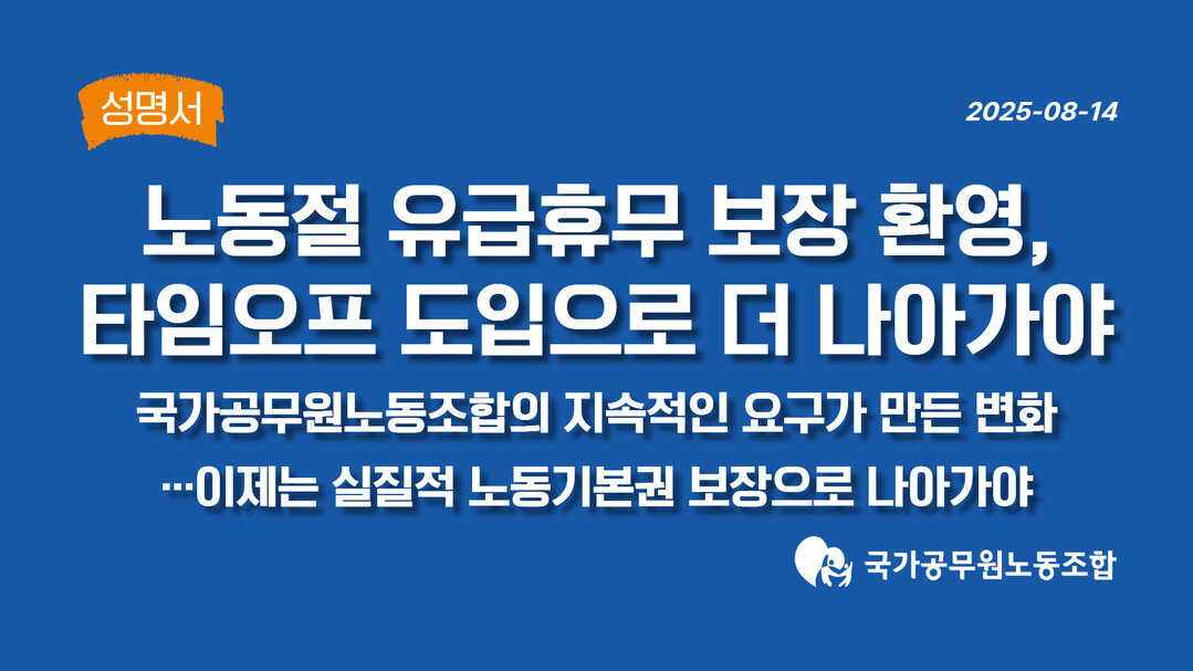 국가공무원노동조합은 14일 성명을 내고 최근 보도된 공무원·교원의 노동절 유급휴무 보장 검토 소식에 대해 “수년간의 지속적인 요구와 현장 조합원의 실천이 만들어낸 소중한 성과”라며 환영 입장을 밝혔다. 노조는 기자회견, 국회 청원, 대정부 교섭, 노동절 주간 행사 등을 통해 제도 개선을 꾸준히 요구해 왔으며, 정부가 긍정적으로 논의를 시작한 것은 의미 있는 변화라고 평가했다.