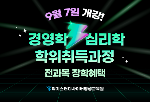 [피앤피뉴스=서광석 기자] 학점은행제 원격교육기관인 여기스터디사이버평생교육원은 내달 7일 경영학/심리학 학위취득이 가능한 학점은행제 전 과정을 개강하고 수강생을 모집한다고 29일 밝혔다.