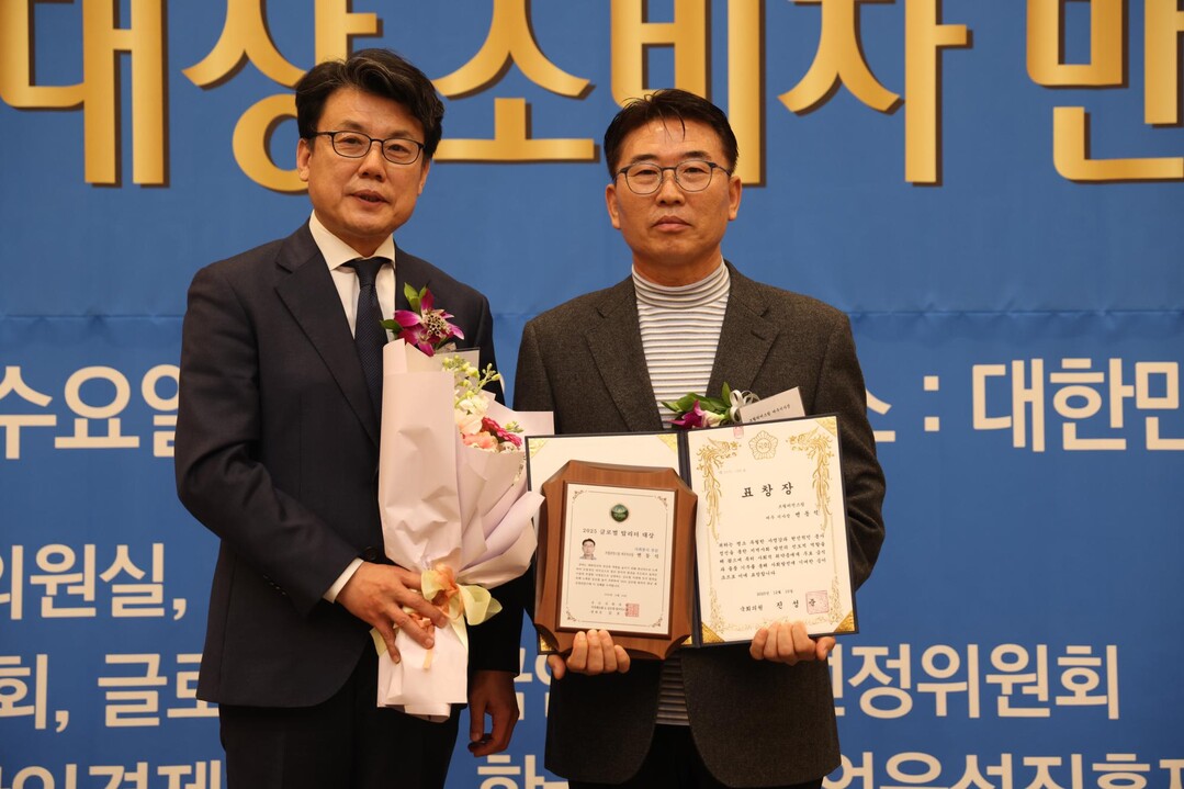 | ▲변동석 브릴리언스팀 여주 지사장(오른쪽)이 진성준 국회의원으로 부터 2025 ‘국정감사 우수국회의원, 지자체 大賞, 글로벌 탑리더 大賞’ 사회 봉사 부문 대상을 수상하고 있다. |