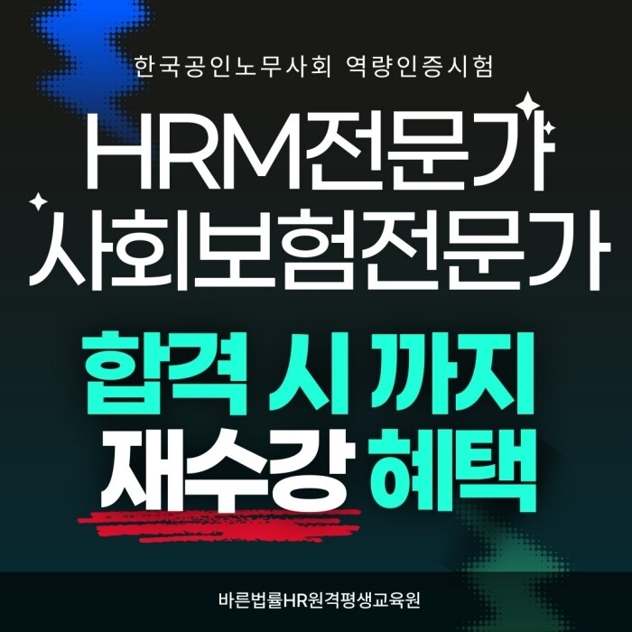 바른법률HR원격평생교육원은 한국공인노무사회 HRM전문가 및 사회보험전문가 역량인증과정 수료생이 시험에 불합격하더라도, 2026년까지 무료로 재수강할 수 있도록 지원한다고 20일 밝혔다.