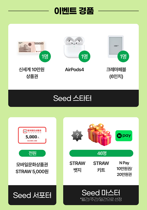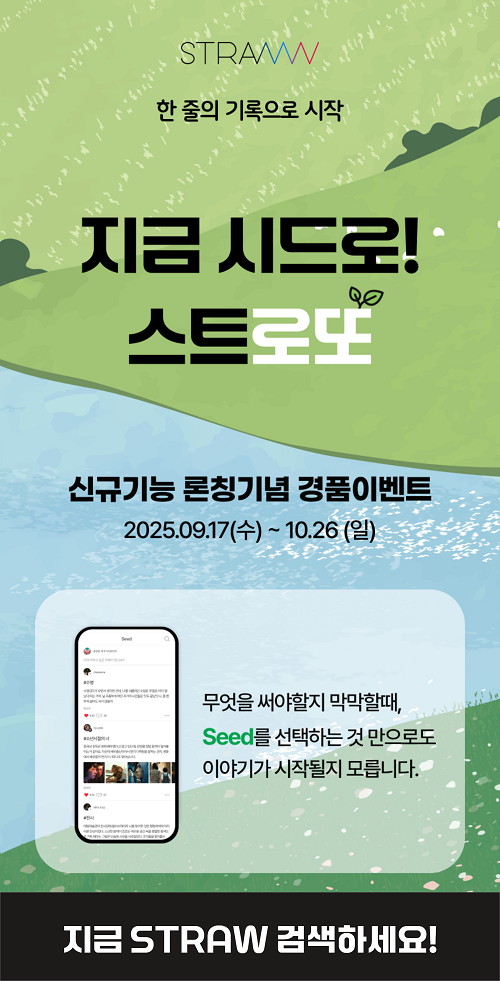 ㈜비케이 씨앤씨 변정후 사업팀장은 “Seed는 기록을 시작하는 가장 쉬운 출발점이자 STRAW가 지향하는 커뮤니티 문화의 핵심”이라며 “이번 이벤트가 단순한 혜택에 그치지 않고, 이용자들이 Seed를 통해 새로운 이야기를 만들고 서로 연결되는 계기가 되길 바란다”고 말했다.