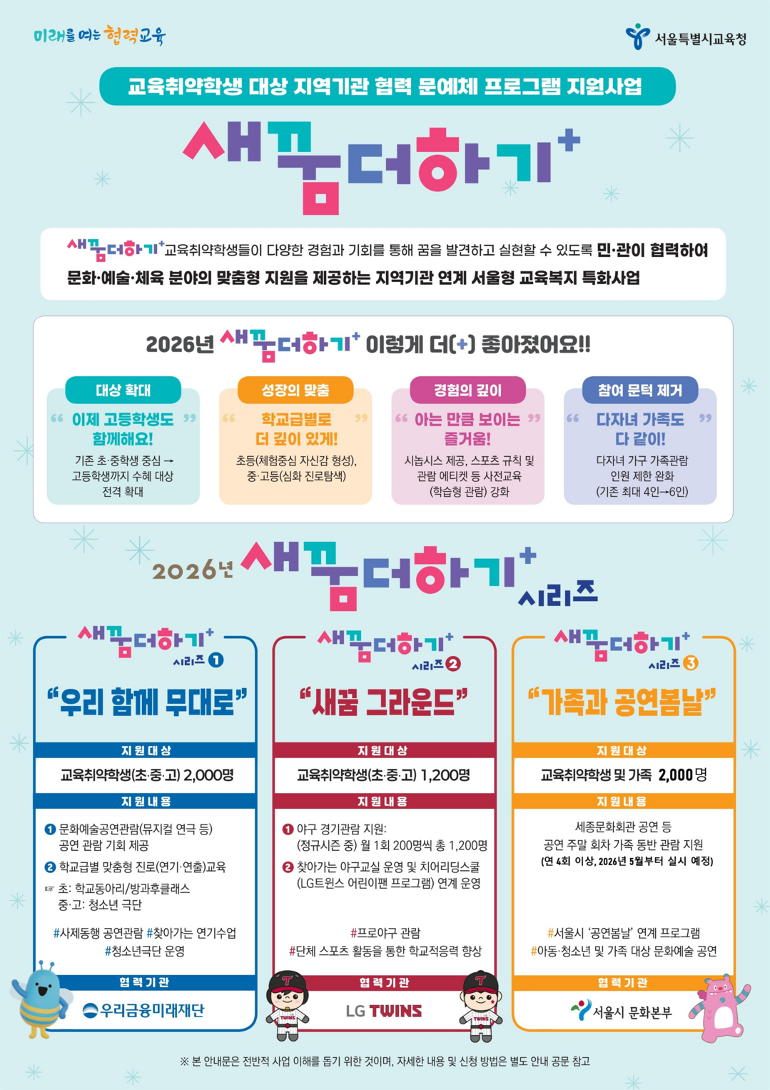 서울특별시교육청은 지역기관과 민간 기업 협력을 기반으로 운영 중인 교육복지 프로그램을 올해 확대 운영한다고 밝혔다.
