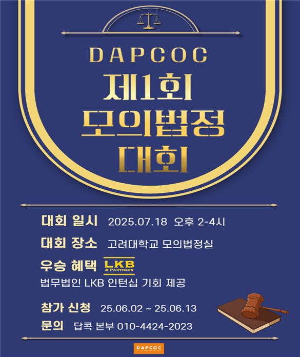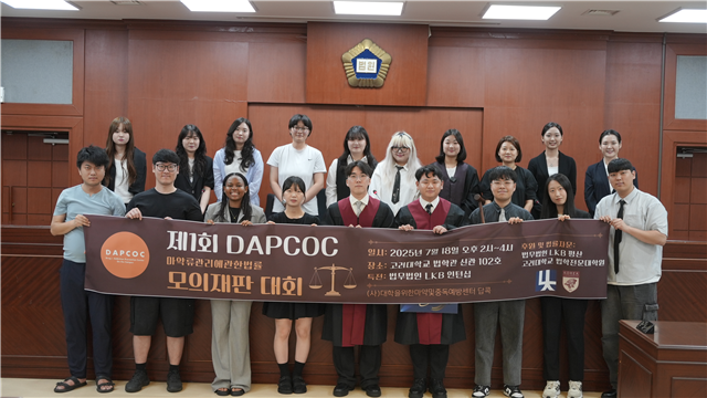 [피앤피뉴스=마성배 기자] 마약 중독 문제의 심각성을 알리고, 법적 책임과 사회적 포용에 대한 청년들의 시각을 공유하는 이색 모의재판이 열렸다. (사)대학을위한마약중독예방재활센터(DAPCOC, 이사장 두상달)는 지난 18일 오후 2시, 고려대학교 법학전문대학원 신관 모의법정실에서 ‘제1회 마약류관리에관한법률 모의재판’을 성공적으로 개최했다고 22일 밝혔다.