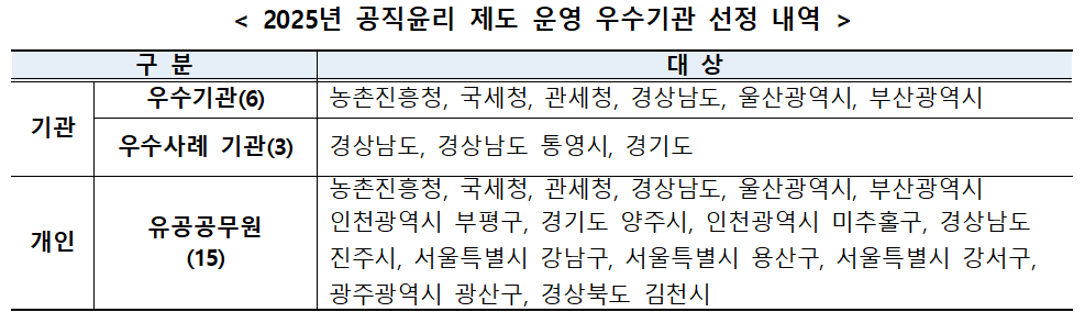 점검 결과 공직윤리제도 운영 우수기관으로 ▲농촌진흥청 ▲국세청 ▲관세청 ▲경상남도 ▲울산광역시 ▲부산광역시 등 6개 기관이 선정됐다. 이들 기관은 재산등록 관리의 체계성, 심사 운영의 적정성, 공직윤리 전반에 대한 내부 관리 수준에서 높은 평가를 받았다.