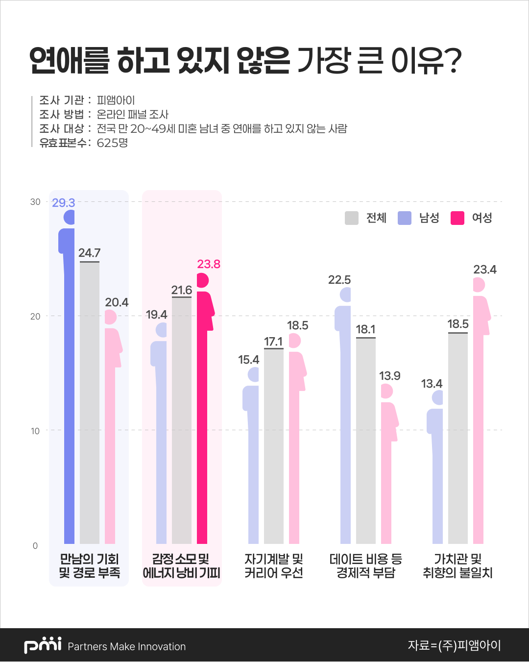 데이터 컨설팅 기업 피앰아이(PMI)가 전국 만 20~49세 미혼 남녀 1,000명을 대상으로 실시한 설문조사 결과도 이를 뒷받침한다. 현재 연애 중이라고 답한 비율은 37.5%에 불과해, 미혼 남녀 10명 중 6명 이상이 연애를 하고 있지 않은 것으로 나타났다.