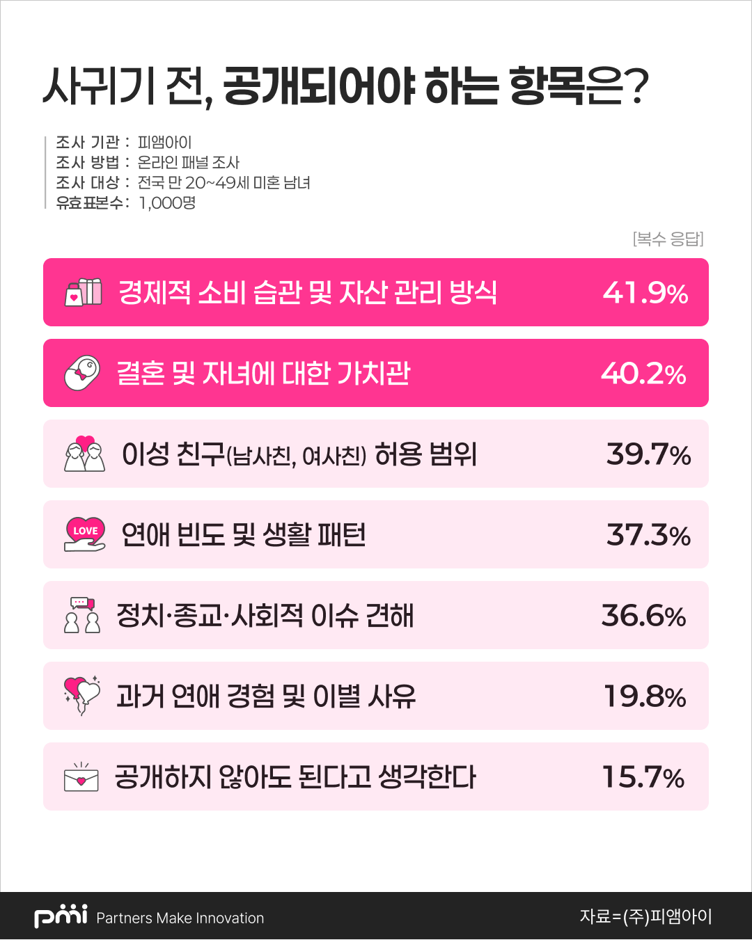 정식 교제 전 공개·합의가 필요하다고 본 항목은 ‘경제적 소비 습관 및 자산 관리 방식’(41.9%), ‘결혼 및 자녀에 대한 가치관’(40.2%), ‘이성 친구 허용 범위’(39.7%)가 상위권을 차지했다. 이어 ‘연애 빈도 및 생활 패턴’(37.3%), ‘정치·종교·사회적 이슈에 대한 견해’(36.6%), ‘과거 연애 경험’(19.8%) 순으로 나타났다. 특히 ‘결혼·자녀 가치관’의 중요성은 30대(47.5%)와 40대(49.2%)에서 20대(35.0%)보다 높아, 연령이 높아질수록 연애가 삶의 설계와 직결되는 경향이 뚜렷했다.