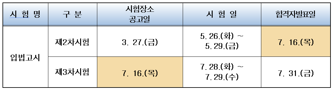 변경된 일정에 따르면 제2차시험 합격자 발표는 7월 16일, 제3차시험은 7월 28일부터 29일까지 이틀간 실시되며 최종 합격자는 7월 31일 발표될 예정이다.