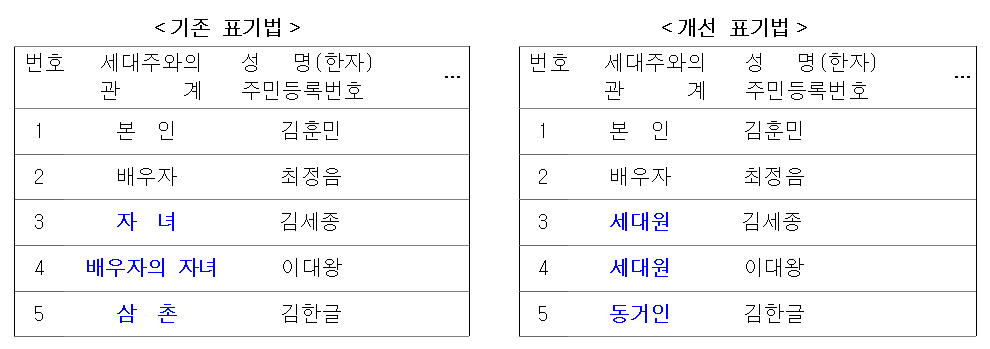 구체적으로, 세대주의 배우자 외 가족(부모, 조부모, 형제자매 등)은 ‘세대원’, 그 외의 경우는 ‘동거인’으로 표기된다. 다만, 민원인이 원할 경우 기존 방식대로 상세 가족관계 표기를 선택할 수 있다.