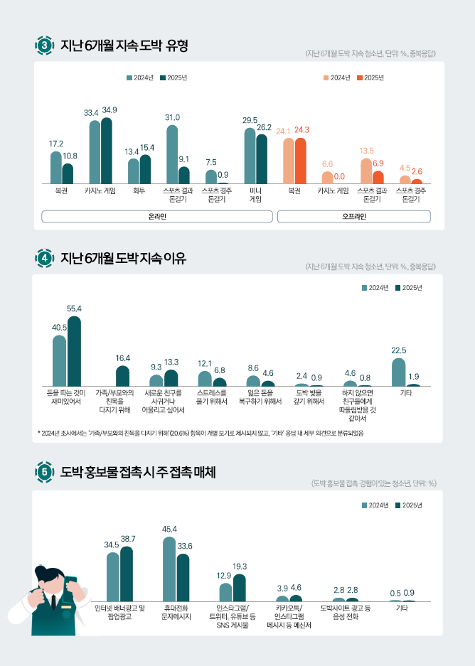 도박 광고와 홍보물 노출도 심각한 수준으로 조사됐다. 청소년의 54.0%가 도박 광고나 홍보물을 접한 경험이 있다고 응답했으며, 주요 경로는 인터넷 배너·팝업 광고가 38.7%로 가장 많았다. 이어 휴대전화 문자메시지 33.6%, SNS 게시물 19.3% 순으로 나타나 디지털 환경 전반에서의 무차별 노출 문제가 지적됐다.