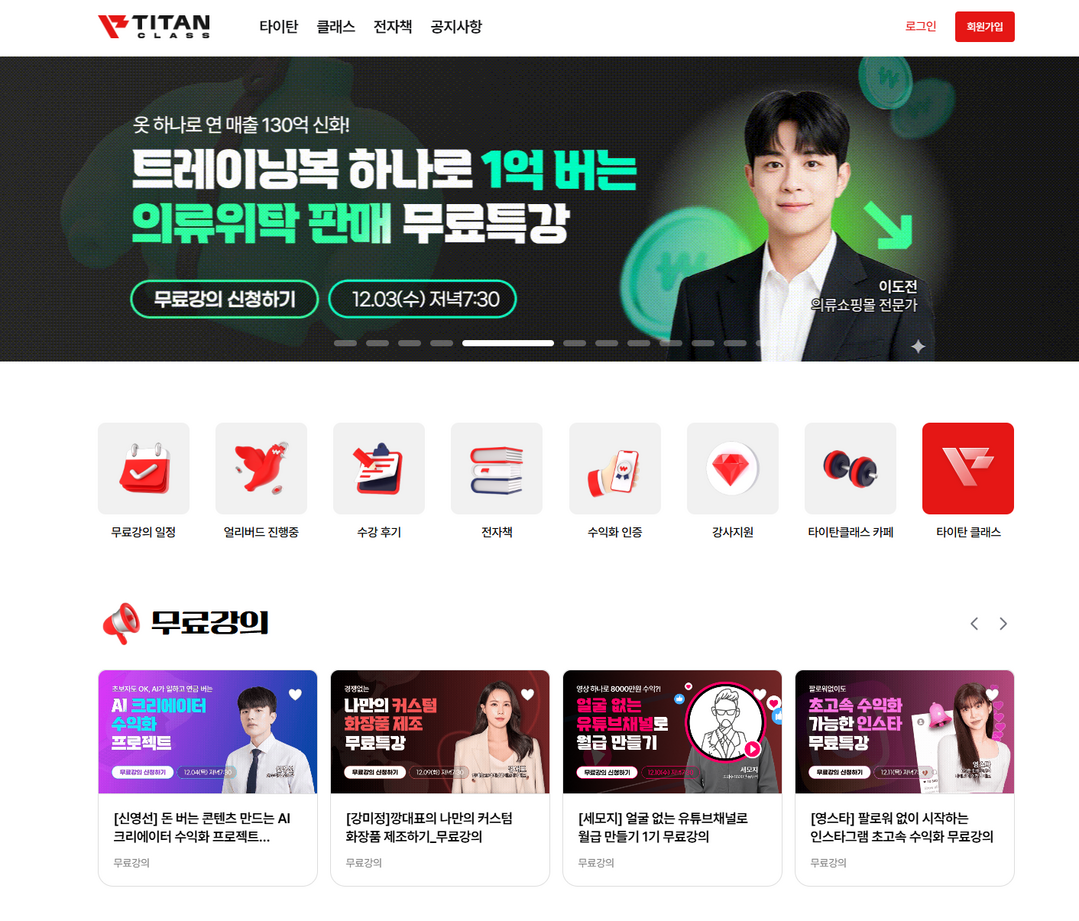 에듀테크 기업 타이탄컴퍼니의 교육 플랫폼 ‘타이탄 클래스’가 12월 한 달간 온라인 수익화를 주제로 총 9개의 무료 강의를 진행한다고 밝혔다. 이번 프로그램은 “우리는 두 번째 기회를 제공합니다”라는 브랜드 철학을 앞세워, 부업과 자기계발에 관심 있는 일반인을 대상으로 실전에 가까운 수익화 노하우를 제공하는 것이 목표다.