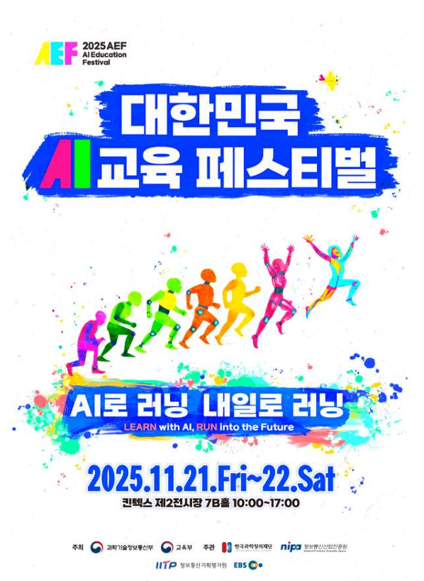 [피앤피뉴스=마성배 기자] 교육부와 과학기술정보통신부가 공동 주최하고 한국과학창의재단과 정보통신산업진흥원이 주관하는 ‘2025 대한민국 인공지능(AI) 교육 축제’가 11월 21일부터 이틀간 일산 킨텍스 제2전시장에서 열린다.