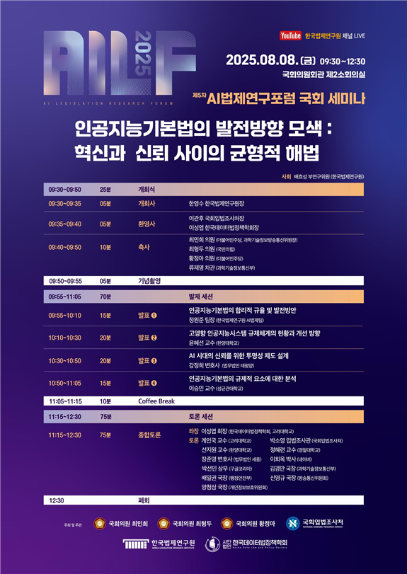 한국법제연구원(원장 한영수)은 오는 8일(금) 오전 9시 30분, 국회의원회관 제2소회의실에서 ‘인공지능기본법의 발전방향 모색: 혁신과 신뢰 사이의 균형적 해법’을 주제로 제5차 AI법제연구포럼 국회 세미나를 개최한다고 밝혔다.