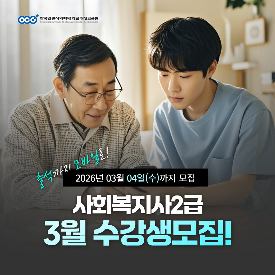 한국열린사이버대학교 평생교육원이 사회복지사 2급 자격과정 3월 개강반 수강생을 모집한다고 밝혔다. 모집 마감은 3월 4일(수)까지이며, 개강일은 3월 5일(목)이다.