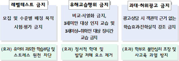 정부는 학원법 개정을 통해 유아 대상 레벨테스트를 전면 금지한다. 지필시험뿐 아니라 구술평가 등 사실상 학습 수준을 측정하는 모든 형태의 평가가 금지 대상에 포함된다.