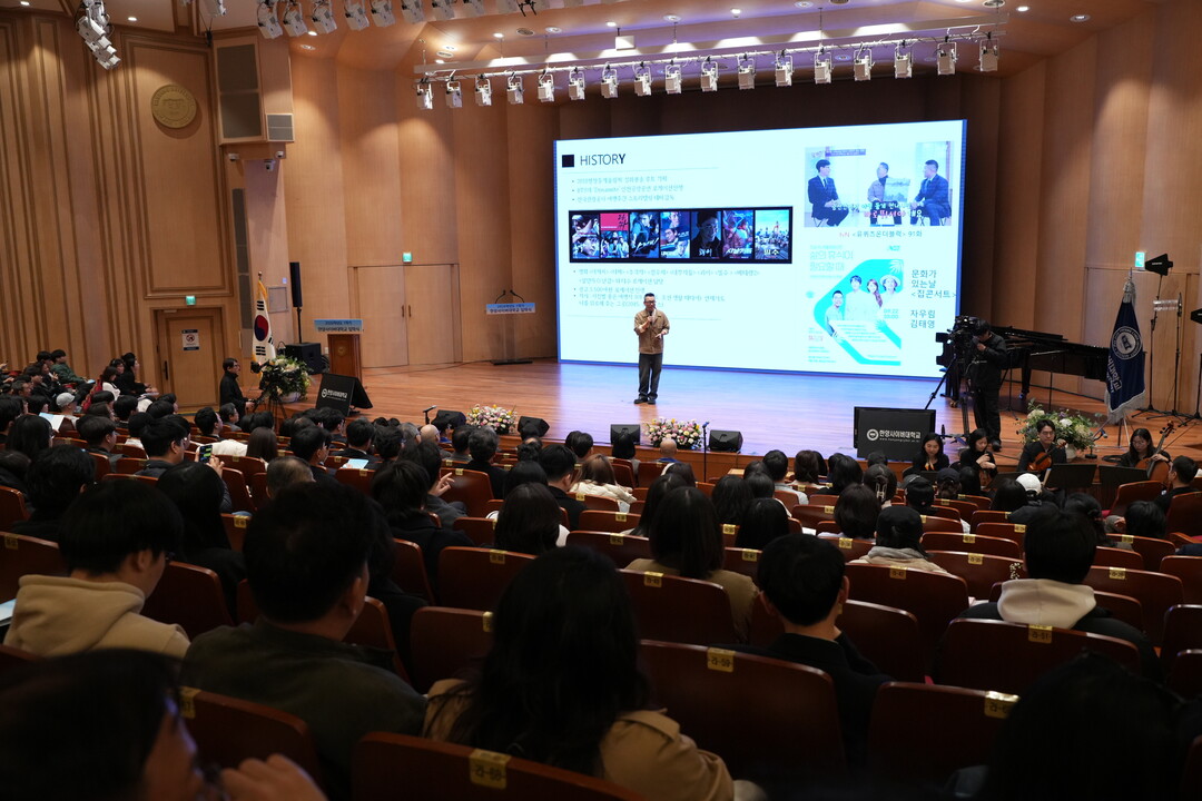 ▲2026학년도 1학기 입학식에서 한양사이버대학교 디자인 대학원을 졸업한 김태영 동문(주식회사 로마로 대표)이 입학생들을 위한 특별 강연을 진행하고 있는 모습.