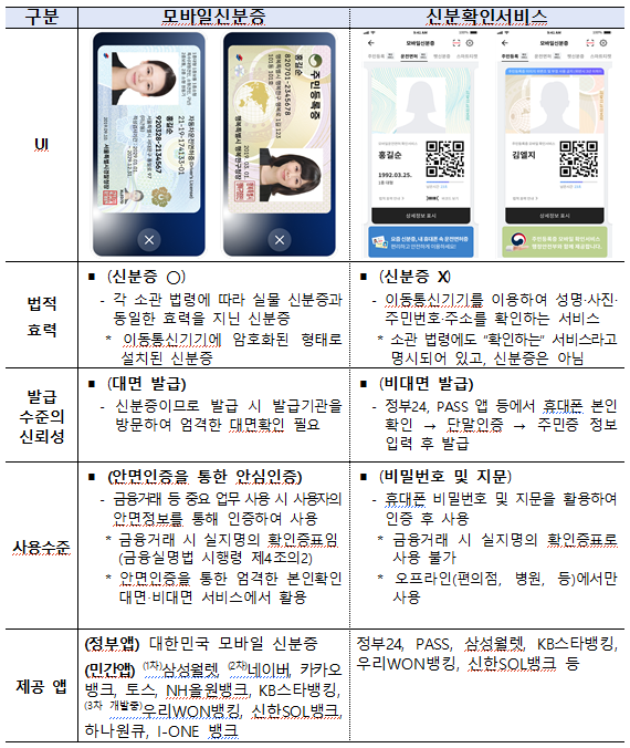 | ▲모바일신분증과 신분확인서비스 비교(출처: 행정안전부) |