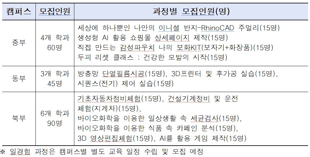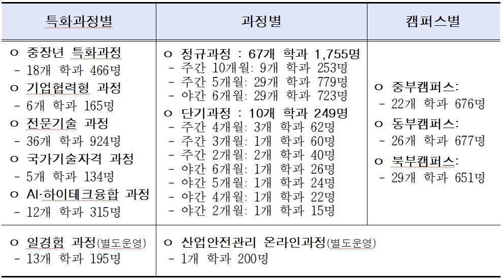 산업 현장의 변화에 맞춰 학과 신설도 이뤄졌다. 동부캠퍼스에는 지능형공조냉동 과정이 신설돼 AI 기반 예측제어와 데이터 분석을 활용한 건물 공조·냉동 시스템 교육을 진행한다. 북부캠퍼스에는 AI활용게임개발, 설비보전·시설관리, 옻칠 과정이 새로 개설돼 문화콘텐츠, 산업설비 유지보수, 전통 공예 분야 전문 인력을 양성한다. 지난해 신설된 중장년 AI활용과정, 자동차 썬팅·광택, 스마트 승강기 시퀀스 과정은 평균 1.86대 1의 경쟁률을 기록하며 높은 수요를 입증한 바 있다.