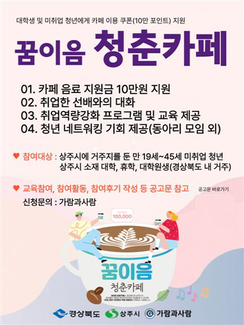 이 사업은 미취업 청년들에게 카페 이용 쿠폰(10만 포인트)을 지원하고, 상주 청년이 직접 운영하는 지역 내 지정 카페 4곳에서 사용 가능하도록 한 것이 핵심이다.