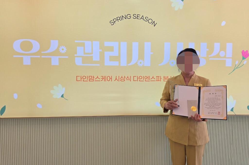 한편, 다인맘스케어는 이번 시상을 통해 김O미관리사에게 공로상을 수여하며 그간의 깊은 노고와 헌신에 대한 감사의 뜻을 전했다.
