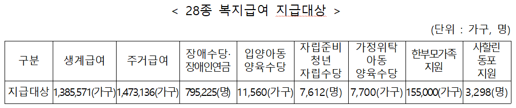 조기지급 대상에는 생계급여와 주거급여뿐 아니라 장애수당과 장애인연금, 입양아동 양육수당, 자립준비청년 자립수당, 가정위탁아동 양육수당, 한부모가족 지원금, 사할린동포 지원금 등 총 28종의 복지급여가 포함된다. 이번 조치는 보건복지부를 중심으로 국토교통부, 여성가족부, 재외동포청 등 4개 부처가 공동으로 참여했다.