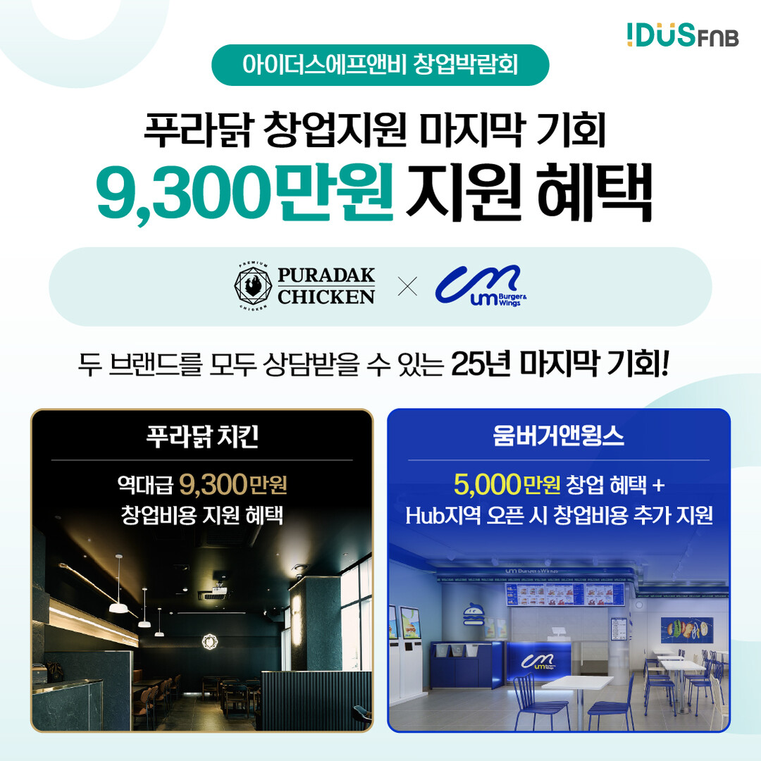 오븐·후라이드 치킨 전문 브랜드 ‘푸라닭 치킨’과 치킨 버거·윙 전문 브랜드 ‘움버거앤윙스’를 운영하는 아이더스에프앤비가 오는 12월 10일과 17일 양일간 통합 창업박람회를 개최하며 사전 접수를 시작했다. 이번 박람회는 푸라닭 치킨의 10주년 프로젝트인 ‘푸라닭 2.0’의 핵심 모델 ‘딥블랙’과, 빠르게 성장하고 있는 ‘움버거앤윙스’ 창업 정보를 한 자리에서 제공하는 행사다.