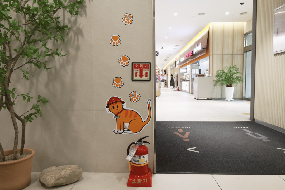 많은 시민들이 건물이나 매장에 비치된 소화기의 정확한 위치를 모른다는 점에 착안해, 캠페인팀은 고양이 캐릭터 ‘소방냥이’와 발자국 스티커를 활용해 소화기 방향을 안내하는 시각적 장치를 고안했다.