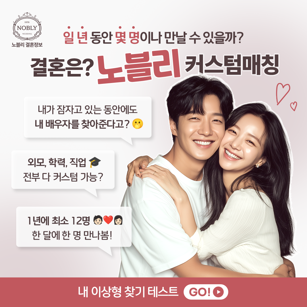 해당 이벤트를 진행하는 노블리는 국내 상위 0.1%의 고소득층과 정재계, 전문직 회원 비율이 높은 것이 특징이다. 오랜 기간 ‘상류층 결혼 매칭’ 분야에서 경쟁력을 쌓아왔다. 이번 커스텀 매칭 이벤트는 보다 정밀한 기준으로 상대를 찾고자 하는 회원들의 니즈를 반영해 기획됐다.