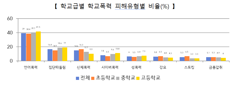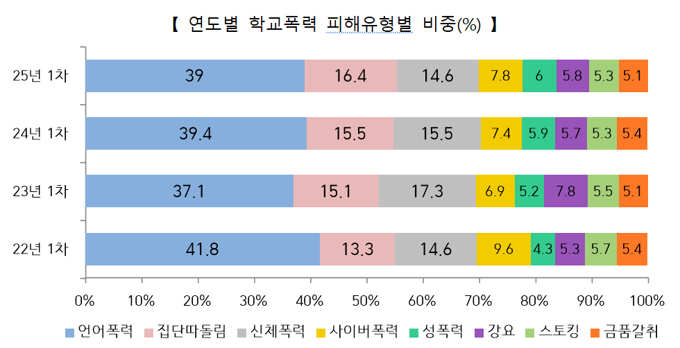 피해 유형은 ‘언어폭력’(39.0%)이 가장 많았고, 이어 ‘집단 따돌림’(16.4%), ‘신체폭력’(14.6%), ‘사이버폭력’(7.8%) 순으로 조사됐다. 언어폭력과 신체폭력은 감소한 반면, 집단 따돌림과 사이버폭력은 증가했다.