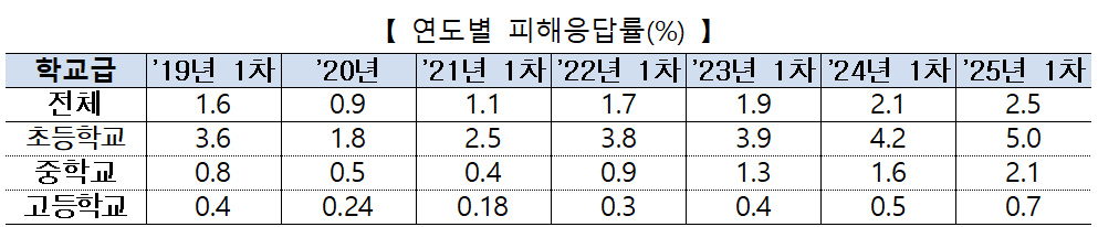 피해 경험을 밝혔다고 답한 학생은 전체의 2.5%였다. 학교급별로는 초등학교 5.0%, 중학교 2.1%, 고등학교 0.7% 순으로, 특히 초등학교에서 피해 비율이 높았다.