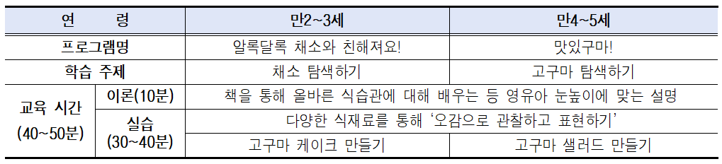 교육 내용도 실생활 중심으로 알차게 구성됐다. 만 2~3세 아이들은 고구마·오이·당근 등 다양한 채소를 직접 만지고 관찰한 뒤, 채소 스틱을 고구마에 꽂아 ‘고구마 케이크’를 만들어보며 오감을 자극하는 활동을 한다.