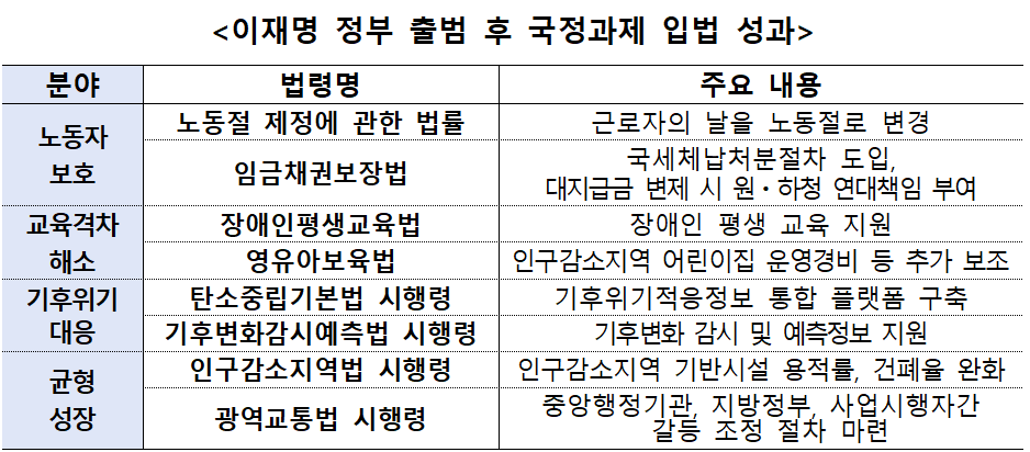 출범 이후 현재까지 국정과제 법령 72건(법률 48건·하위법령 24건)의 제·개정이 완료됐다. 정부는 연내 법률 71건을 추가로 국회에 제출하고, 하위법령 46건의 제·개정을 마무리한다는 계획이다. 그동안 노동자 보호, 교육격차 해소, 기후위기 대응, 균형성장 등 다양한 분야에서 입법 성과가 도출됐으며 사회적 약자를 보호하는 법률도 꾸준히 추진되고 있다.