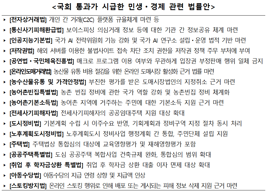 특히 전세사기피해자법, 아동수당법 등 국민 실생활과 직결된 민생 법안은 “시급성과 중요도를 고려해 반드시 정기국회에서 통과시키겠다”는 입장이다.