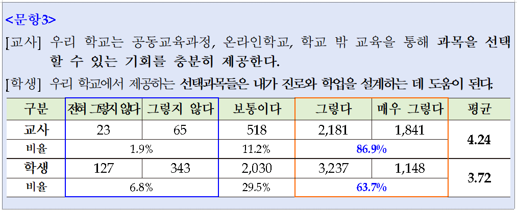 설문은 ▲학교 교육과정 운영 ▲과목 선택 지도 ▲최소 성취수준 보장지도 등 3개 영역에 대해 5점 척도로 이뤄졌다.