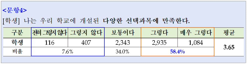 또 개설된 선택과목에 만족하는 학생 역시 58.4%에 그쳐 상대적으로 가장 낮은 수치를 보였다.