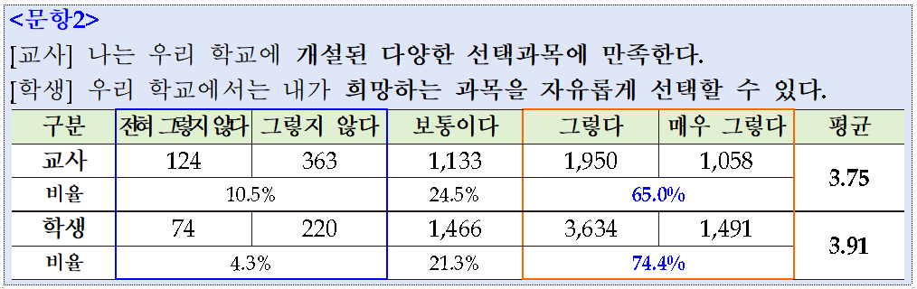 교사의 79.1%는 “학생 요구를 충족할 만큼 교과가 개설되고 있다”고 응답한 반면, 학생은 58.3%만 긍정했다.