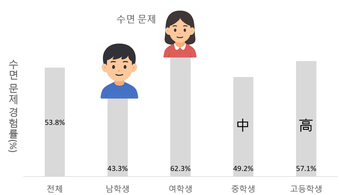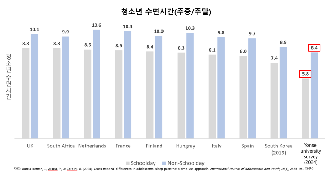 청소년들의 평균 수면시간은 주중 5.8시간, 주말 8.4시간으로 OECD 국가 중 최하위였다. 2019년과 비교하면 주말 수면은 30분, 주중 수면은 무려 1시간 36분이나 줄었다. 여학생이 남학생보다, 고등학생이 중학생보다 수면 문제가 더 심각했다.