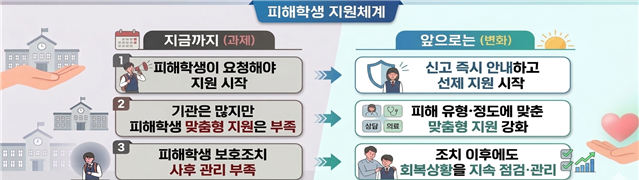 피해학생 지원 방식도 달라진다. 앞으로는 학교폭력 신고가 접수되면 학교장이 피해학생과 보호자에게 보호조치와 상담·치유 서비스를 먼저 안내해야 한다.