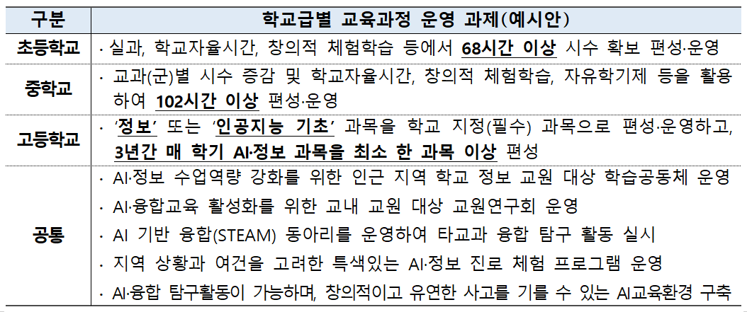 이번 사업의 핵심은 단순히 컴퓨터 활용 시간을 늘리는 데 있지 않다. 초등학교는 실과와 창의적 체험활동, 학교자율시간을 활용해 인공지능 관련 교육 시간을 기존 34시간 수준에서 68시간 이상으로 늘린다. 중학교는 교과 시수 조정과 자유학기제 등을 활용해 102시간 이상 확보해야 한다. 고등학교는 ‘정보’ 또는 ‘인공지능 기초’를 학교 지정 과목으로 두고 3년 동안 매 학기 관련 과목을 최소 1개 이상 편성해야 한다.