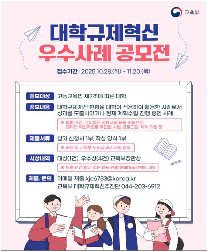 10월 28일부터 11월 20일까지 ‘2025 대학 규제혁신 우수사례 공모전’을 진행한다.
