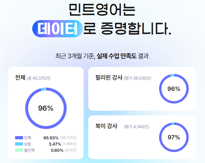 서비스 만족도도 내부 조사에서 일정 수준을 유지한 것으로 나타났다. 민트영어에 따르면 최근 3개월간 수강생 대상 조사에서 화상·전화영어 수업 만족도가 95% 이상으로 집계됐다.