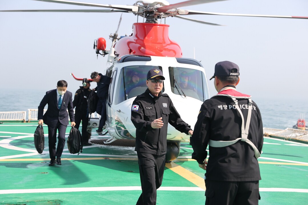 <2023년 5월 9일 불법 외국어선 단속 훈련 위해 헬기에서 경비함정으로 착함하고 있는 김종욱 청장. 사진=해양경찰청>