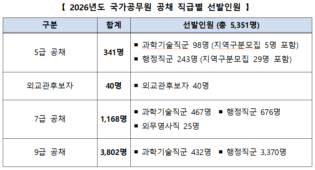 2026년 국가공무원 공개경쟁채용시험 선발 인원은 총 5,351명으로 확정됐다. 직급별로는 5급 공채 341명, 외교관후보자 40명, 7급 공채 1,168명, 9급 공채 3,802명이다. 이 가운데 7급 공채에는 근로감독·산업안전 분야 500명이 포함됐다.