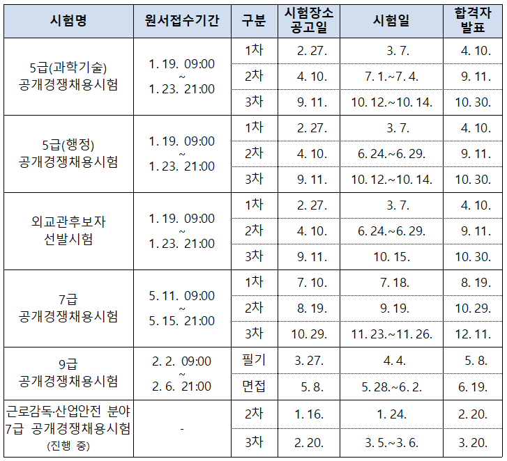 올해 공채 필기시험 일정도 함께 공개됐다. 5급 공채와 외교관후보자 1차 시험은 3월 7일에 동시에 치러지며, 9급 공채 필기시험은 4월 4일, 7급 공채 1차 시험은 7월 18일에 각각 시행된다. 다만 지난해 11월 이미 1차 시험이 진행된 근로감독·산업안전 분야 7급 공채는 기존 일정에 따라 2차 시험이 1월 24일, 3차 시험이 3월 5~6일에 진행된다.