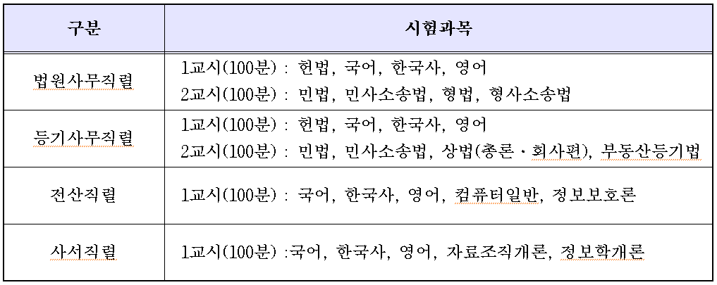 법원사무직렬 및 등기사무직렬의 과목별 문항 수는 각 25문항으로 동일하다. 법원사무직렬 시험과목은 1교시(100분) 헌법·국어·한국사·영어, 2교시(100분) 민법·민사소송법·형법·형사소송법이고, 등기사무직렬 1교시(100분)는 법원사무직렬과 동일하고, 2교시(100분) 민법·민사소송법·상법(총론·회사편)·부동산등기법이다.
