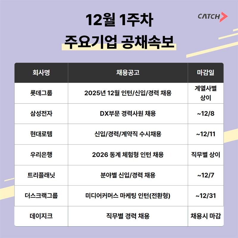 [피앤피뉴스=마성배 기자] 상위권 채용 플랫폼 진학사 캐치는 2025년 12월을 맞아 주요 대기업·중견기업·스타트업의 인턴·신입·경력 모집이 본격적으로 시작됐다고 3일 밝혔다. 이번 달 채용을 진행 중인 기업은 ▲롯데그룹 ▲삼성전자 ▲현대로템 ▲우리은행 ▲트리플래닛 ▲더스크랙그룹 ▲데이지크 등 산업 전반에 걸쳐 다양하다.