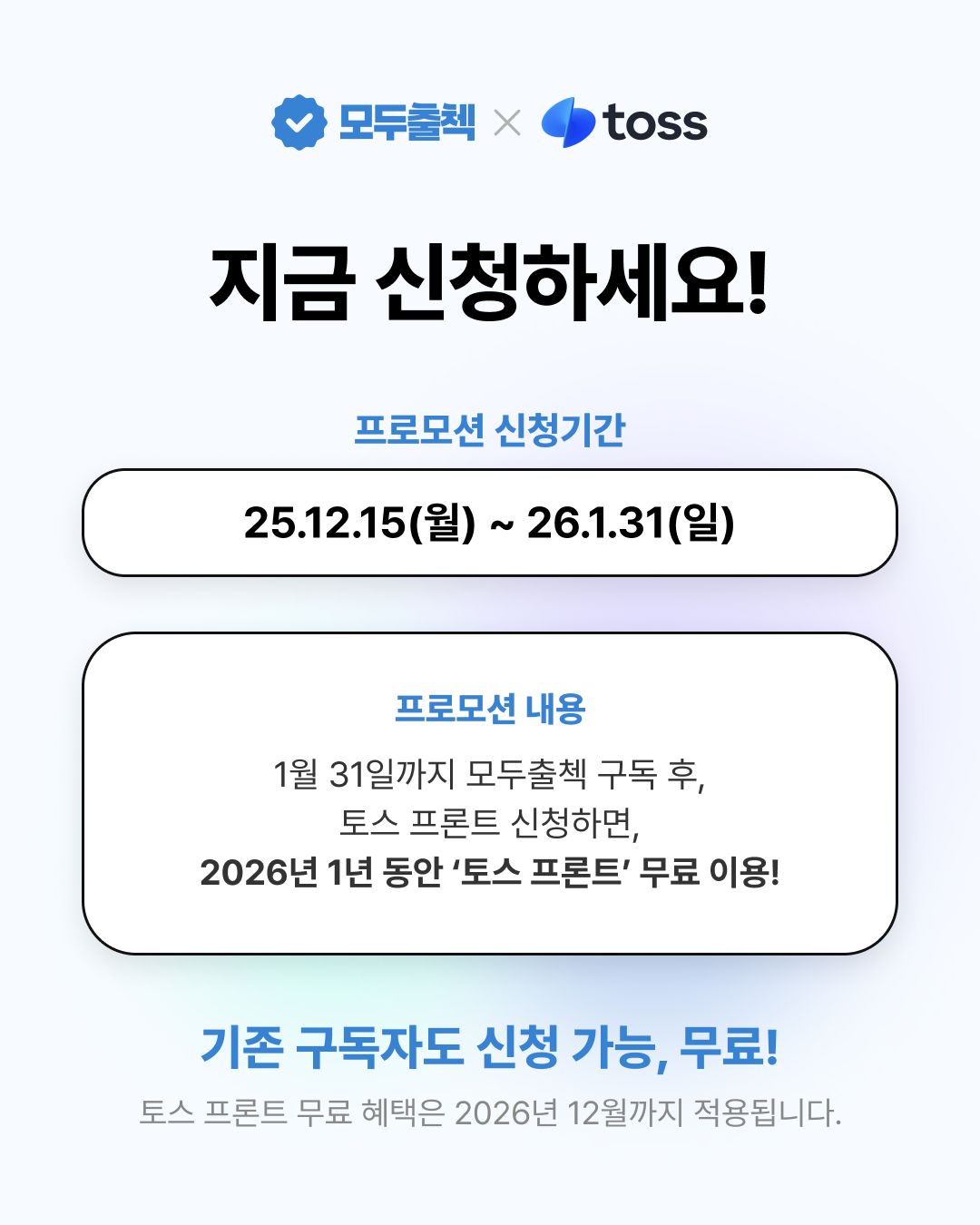 프로모션은 2025년 12월 15일(월)부터 2026년 1월 31일(일)까지 약 7주간 진행된다. 기간 내에 모두출첵 서비스를 구독하고 토스를 사용하는 신규 가입자와 기존 사용자 모두, 2026년 한 해 동안 토스 기기 사용료(월 5,000원)를 전액 면제받는 혜택이 주어진다. 단, 앱 구독료와 알림톡 발송 비용은 별도로 부과된다.