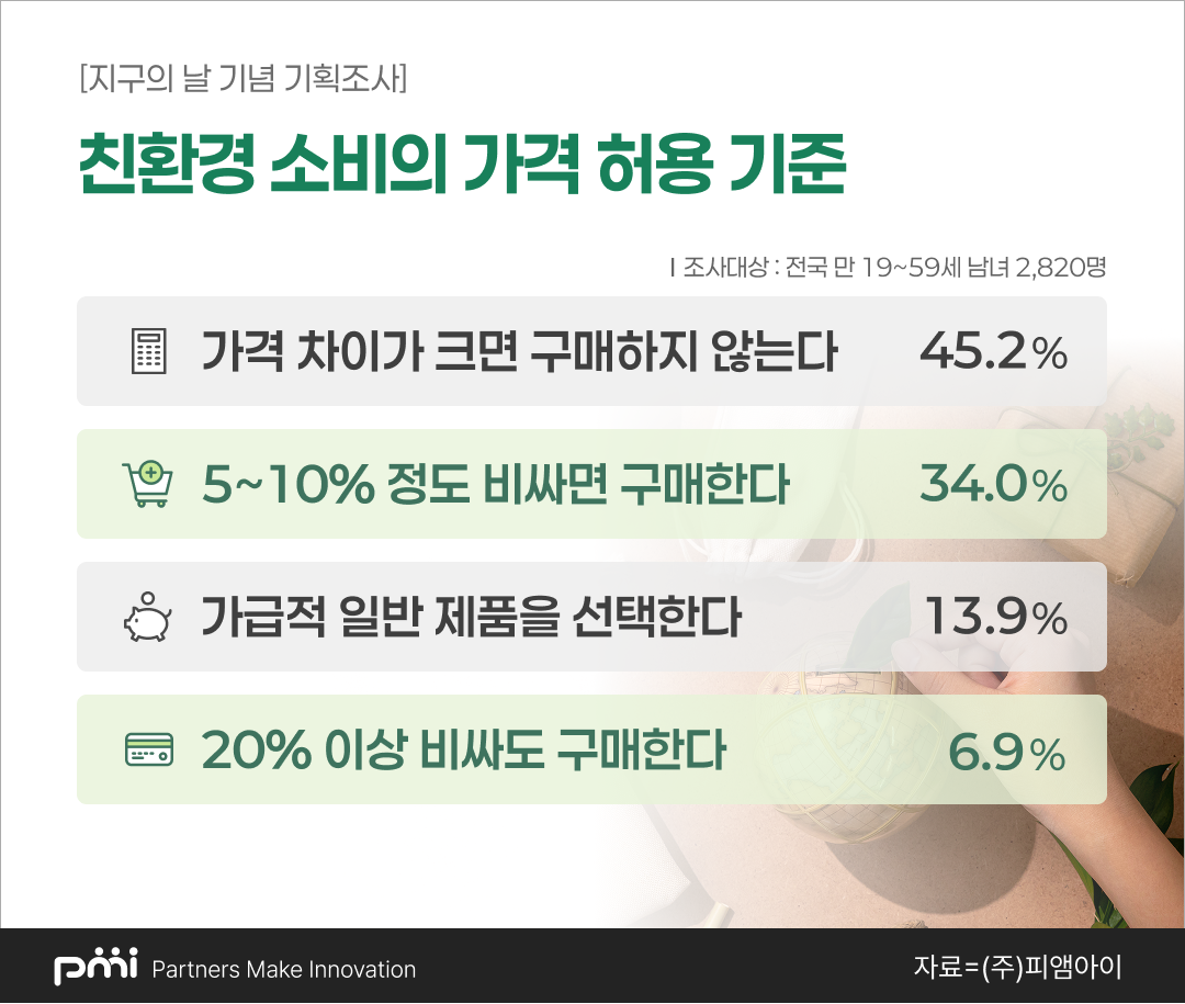 데이터 컨설팅 기업 피앰아이는 전국 만 19~59세 남녀 2,820명을 대상으로 4월 15일부터 17일까지 온라인 설문조사를 실시한 결과, 응답자의 71.7%가 환경 보호를 시급한 문제로 인식하고 있다고 밝혔다.