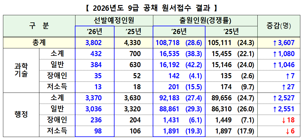 [피앤피뉴스=마성배 기자] 2026년도 국가공무원 9급 공개경쟁채용시험의 평균 경쟁률이 28.6대 1로 집계됐다. 선발 인원은 줄었지만 지원자는 오히려 늘어나며, 다시 한 번 ‘9급 공채 쏠림’ 현상이 뚜렷해졌다.
